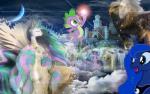 ...Сказка... диаманта... ... Одним прекрасным днем Твайлайт прибежала к своим подружкам взволнованная. - Представляете, исчезла Ее Высочество Селестия! А рядом с ней замок возник, большой, страшный, везде грифон нарисован... - Ой, можно подумать, мы впервые с грифонами дело имеем! - перебив, весело подмигнула Рэйнбоу-Дэш ахнувшим пони, вспоминая свою отпетую приятельницу, - Разберемся... С этими словами молнией полетела радужная лошадка в сторону дворца Селестии. Она долго не могла понять, где Ее Высочество - не было никого, кроме Луны. - Ваше... - робко обратилась она, поклонившись, но принцесса задумчиво и понимающе кивнула, потом сказала: - Она вернется... После - молча вновь стала смотреть в окно, откуда виднелся страшный и странный замок с изображениями грифона... Там тоже не было никого, кроме спящей прелестной, сияющей девушки в прекрасном длинном платье, с точно белоснежным лицом, пушистыми ресницами и переливающимися воздушными... радужными волосами. "Это Ее Светлость!" - ахнул Спайк, балансируя на тонких решетчатых жердочках окна (кроха-дракончик тоже встревожился исчезновением Селестии и первым кинулся на поиски, как только услышал подозрительный, зловещий крик не то орла, не то льва окна замка своей белоснежной правительницы)... Тут ему пришлось пригнуться и старательно глядеть во все глаза, как только за окном к спящей девушке стал приближаться огромный грифон, со строгим взглядом, острым клювом и когтями, с рычанием... "Не смей трогать нашу любимую Селестию!.." - самоотверженно завопил Спайк, зажмурив глаза, чтобы не видеть, как кровожадный хищник, давно им отмеченный в ночном-дневном небе их страны, бродивший по глухим ее уголкам, съест грациозную и маленькую, по сравнению с ним, фигурку. Но как открыл глаза, от удивления чуть не упал с решетки - он увидел вместо крылатого полульва темноволосого юношу, что положил в карман сюртука крохотный диамант алого цвета (дракончик раньше приметил его на лбу грифона). Юноша тихонько гладил Селестию одной рукой, другой проводя пассы рукой (отчего внизу распускались цветы, у каждой из пони появлялась то новая юбочка, то пирожное, то крошечный живой летающий змей-друг; замок принцесс покрывался розовыми лепестками, что осторожно кружились вокруг девушки и, падая, словно обнимали ее нежные щеки... - Караул! - не любившая обновки, воскликнула Рэйнбоу-Дэш, недовольно рассматривая заколку, появившуюся, откуда не возьмись, - Срочно прогоняем этого грифона (магическим посланием Спайк тихонечко, если это можно сказать по его корявым словам и нервным огонечкам послания, рассказал об увиденном). - Он украл Селестию! Нельзя ничего от него брать, вдруг он заколдовал вещи, чтоб мы уснули или забыли, а сам принцесс съесть и мы будем следующими!.. - испугалась Твайлайт. Ее собеседницы, как по команде, обнялись и завизжали. - Цыть! - раздалось сзади тихим голосом. Пони обернулись и увидели Луну, ее плащ развевался, глаза, как всегда глубокомысленны, но видно было, что она чем-то расстроена. Малышки-лошадки замолчали и притихло придвинулись ко строгой, но доброй, родной для каждой из них, сестры Селестии. - Я прогоню его, без паники!.. - отчеканила она и пошла твердым шагом, пони провожали ее жалостливым взглядом, ведь она не вернется, как им казалось... "Мне казалось, или ты не ушел после моего приказа?" - говорила она юноше, что, завиде