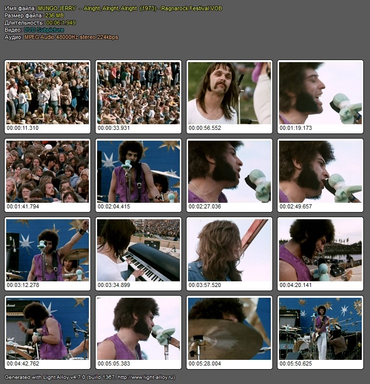 MUNGO JERRY - Alright, Alright, Alright (1973) - Ragnarock Festival VOB Исполнитель:MUNGO JERRY Композиция:Alright, Alright, Alright Жанр:рок-н-ролл,поп,ритм-энд-блюз Год:1973 Видео:MPEG-2(PAL),720x576(4:3),25000fps,5128kbps Аудио:MPEG-1,48000Hz,,2ch,224kbps Размер:236МВ Продолжительность:06.01 Файлообменник: Depositfiles.com