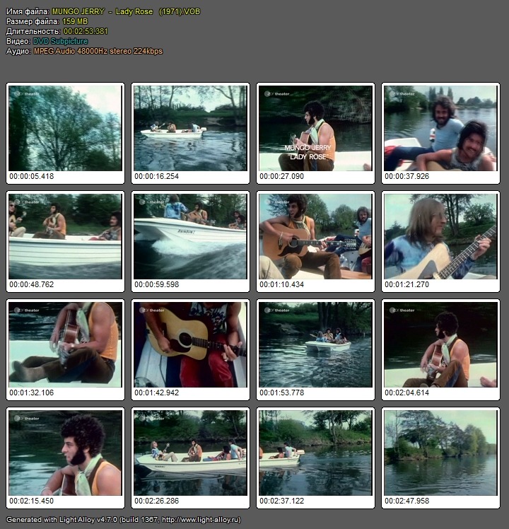 MUNGO JERRY - Lady Rose (1971)VOB Исполнитель:MUNGO JERRY Композиция:Lady Rose Жанр:рок-н-ролл,поп,ритм-энд-блюз Год:1971 Видео:MPEG-2(NTSC),720x480(4:3),29970fps,7296kbps Аудио:MPEG-1,48000Hz,,2ch,224kbps Размер:159МВ Продолжительность:02.53 Файлообменник: Depositfiles.com
