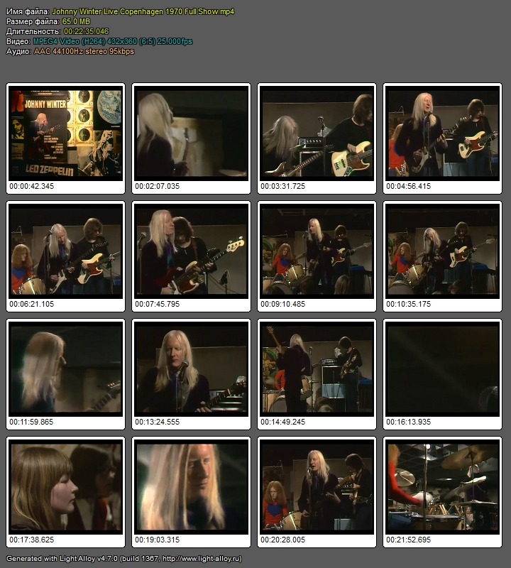 Johnny Winter-Live Сopenhagen in 1970 (from Danish TV) Видео:432x360(1.200),25000fps,AVC(Baseline@L2.1),304kbps Аудио:AAC(LC),44100Hz,2ch,96.0kbps Жанр:pok Год:1970 Размер:64.98МВ Время:22мин. Треклист(Tracklist):01. Mama Talk To Your Daughter 02. Johnny B Goode 03. Be Careful With A Fool 04. Mean Town Blues Johnny Winter-guitar,vocal Tommy Shannon - bass Uncle John Turner - DrumsФайлообменник: Depositfiles.comСкачать(Download):