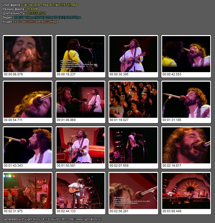 Cat Stevens-Peace Train(1971)mp4 Исполнитель:Cat Stevens Композиция:Peace Train Жанр:фолк-рок Год:1971 Видео:AVC,720x480(4;3)(NTSC),29970fps,3176kbps Аудио:AAC(LC),44100Hz,2ch,227kbps Размер:79.4МВ Время:3мин.14сек. Файлообменник:Depositfiles.comСкачать(Download):