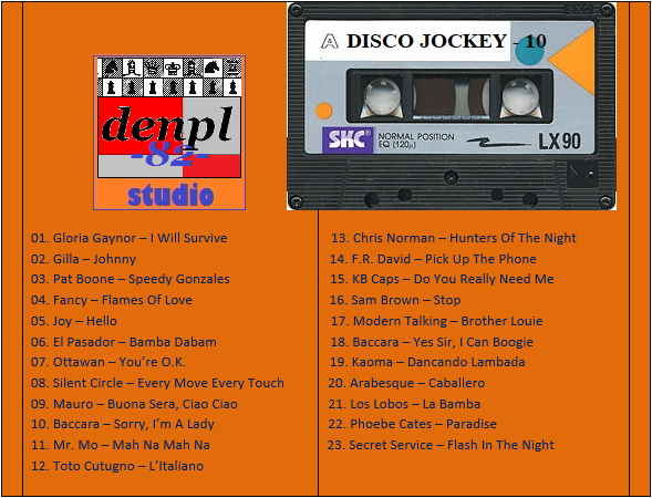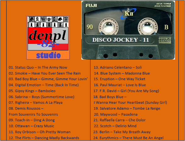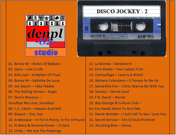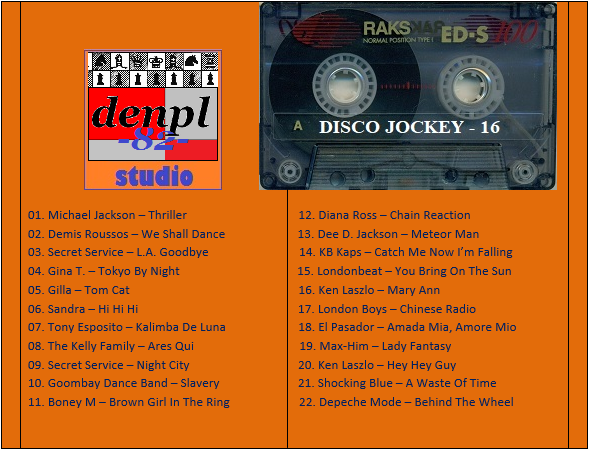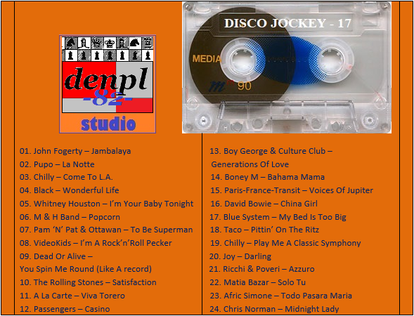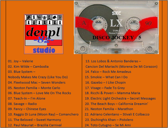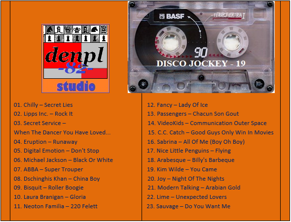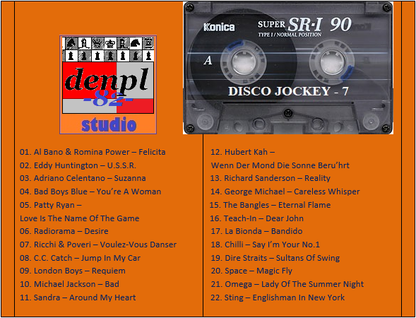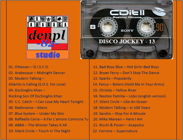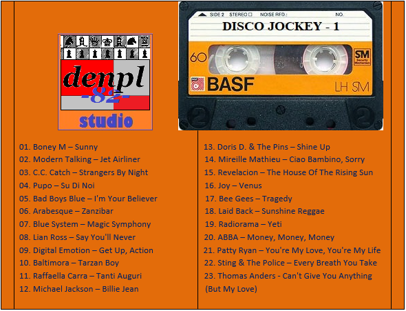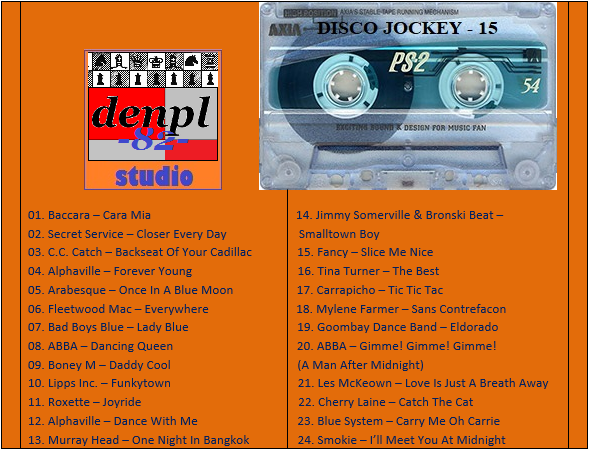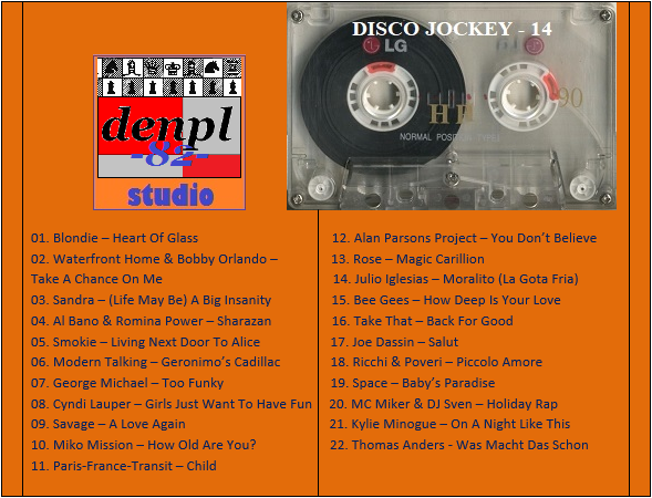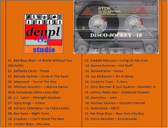 01. Bad Boys Blue – Pretty Young Girl 02. Desireless – Voyage, Voyage 03. Jeanette – Porque Te Vas 04. Irene Cara – Flashdance … What A Feeling 05. Sade – Smooth Operator 06. Blondie – Call Me 07. Radiorama – Hey Hey 08. Elton John & Ru Paul – Don’t Go Breaking My Heart 09. Madonna – Like A Prayer 10. Bad Boys Blue – Save Your Love 11. Pet Shop Boys – Domino Dancing 12. Secret Service – Oh Susie 13. Silent Circle – Moonlight Affair 14. Julio Iglesias – Nathalie 15. Elvis Presley – Jailhouse Rock 16. Ken Laszlo – 1,2,3,4,5,6,7,8 17. Space – Just Blue 18. Scorpions – Wind Of Change 19. ABBA – Mamma Mia 20. Alphaville – Big In Japan 21. Fancy – Spy In The Night 22. Leo Sayer & Alan Parsons Project – I Am A Mirror