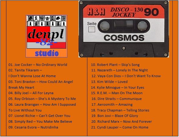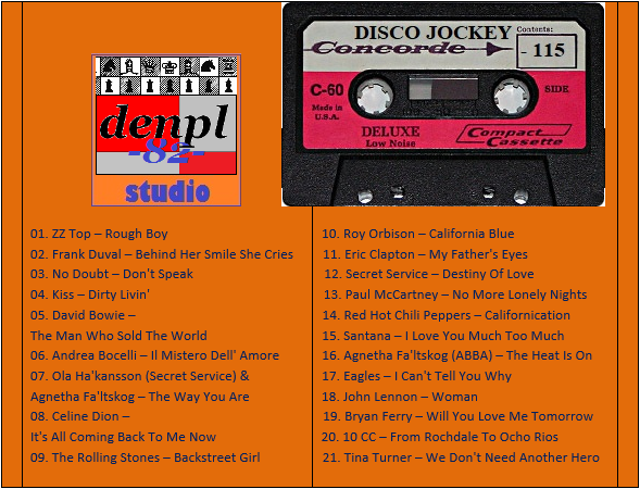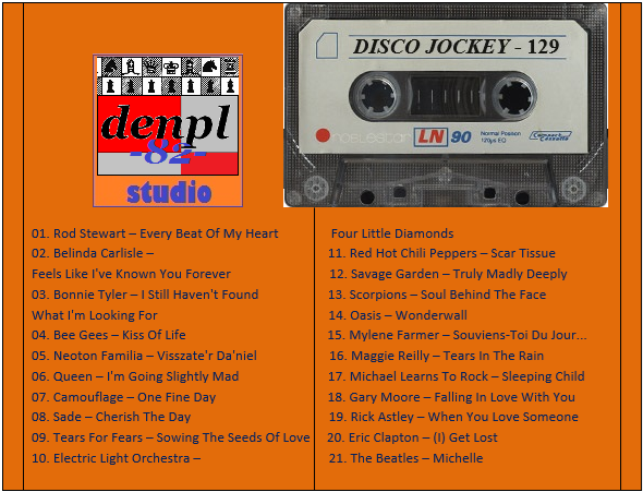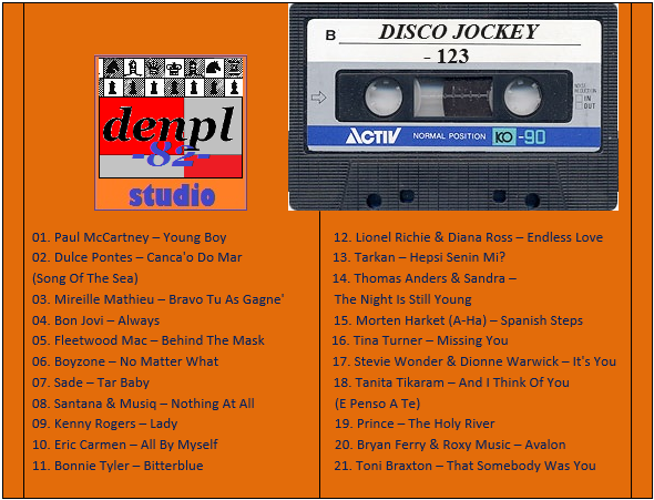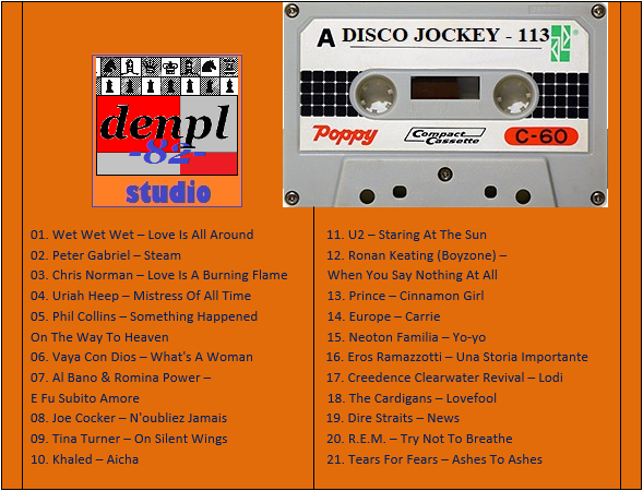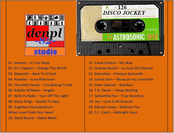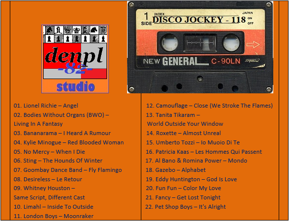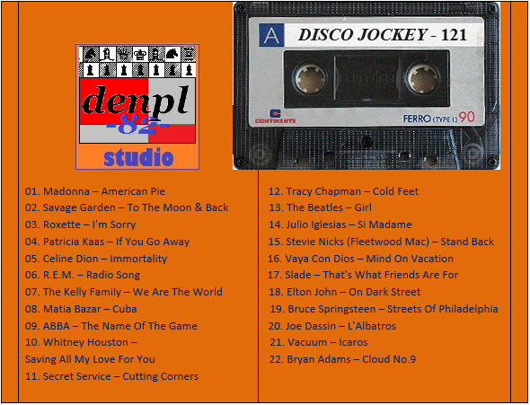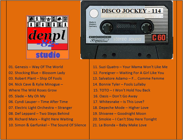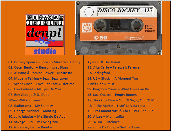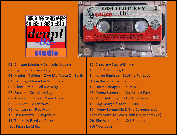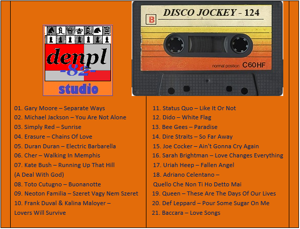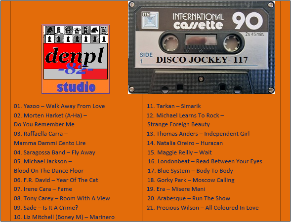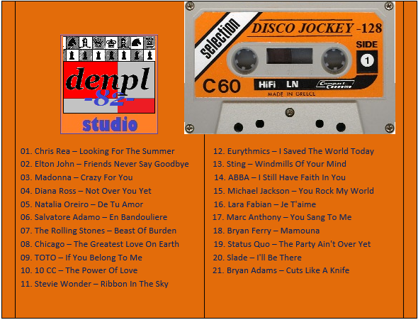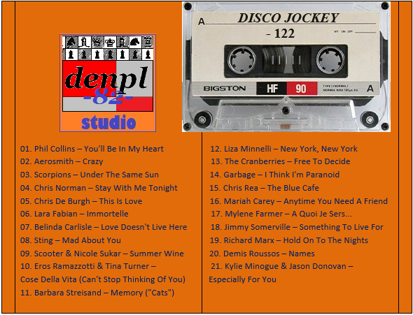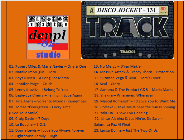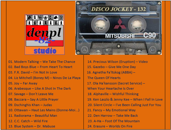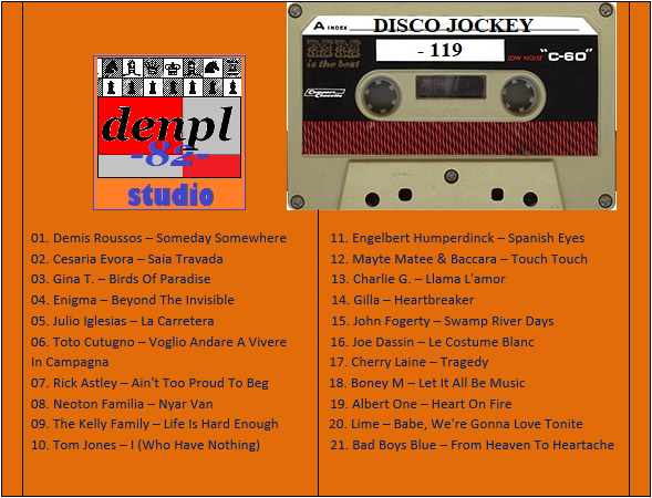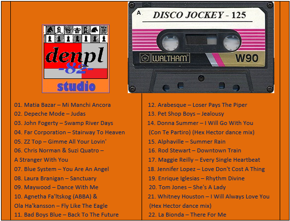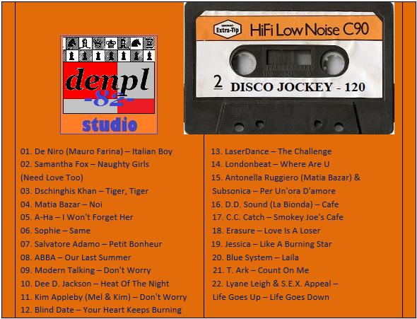01. De Niro (Mauro Farina) – Italian Boy 02. Samantha Fox – Naughty Girls (Need Love Too) 03. Dschinghis Khan – Tiger, Tiger 04. Matia Bazar – Noi 05. A-Ha – I Won't Forget Her 06. Sophie – Same 07. Salvatore Adamo – Petit Bonheur 08. ABBA – Our Last Summer 09. Modern Talking – Don't Worry 10. Dee D. Jackson – Heat Of The Night 11. Kim Appleby (Mel & Kim) – Don't Worry 12. Blind Date – Your Heart Keeps Burning 13. LaserDance – The Challenge 14. Londonbeat – Where Are U 15. Antonella Ruggiero (Matia Bazar) & Subsonica – Per Un'ora D'amore 16. D.D. Sound (La Bionda) – Cafe 17. C.C. Catch – Smokey Joe's Cafe 18. Erasure – Love Is A Loser 19. Jessica – Like A Burning Star 20. Blue System – Laila 21. T. Ark – Count On Me 22. Lyane Leigh & S.E.X. Appeal – Life Goes Up – Life Goes DownP.S. Сборники "Диско Жокей" я собирал в течение четырех лет с начала 2020 года. В них содержатся все самые любимые мною песни времен 70-80-90-х и 2000-х годов в жанрах Евродиско, Италодиско, Европоп, Дэнспоп, Синтипоп, Попрок, Рок, ВИА-эстрада, Шансон и Евро-инструментал.