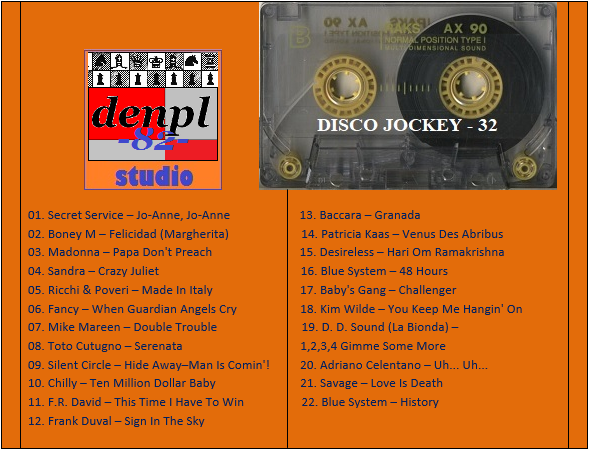 DISCO JOCKEY – 32 Студия «denpl-82». Составил и Смикшировал: DJ denpl-82 Время звучания: 91,5 min.