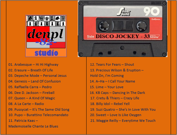01. Arabesque – Hi Hi Highway 02. Erasure – Breath Of Life 03. Depeche Mode – Personal Jesus 04. Genesis – Land Of Confusion 05. Raffaella Carra – Pedro 06. Dee D. Jackson – Fireball 07. Queen – A Kind Of Magic 08. A La Carte – Radio 09. Pussycat – It’s The Same Old Song 10. Pupo – Burattino Telecomandato 11. Patricia Kaas – Mademoiselle Chante Le Blues 12. Tears For Fears – Shout 13. Precious Wilson & Eruption – Hold On, I’m Coming 14. A–Ha – I Call Your Name 15. Lime – Your Love 16. KB Caps – Dancing In The Dark 17. Cretu & Thiers – Crazy Life 18. Billy Idol – Rebel Yell 19. Suzi Quatro – She’s In Love In You 20. Sweet – Love Is Like Oxygen 21. Maggie Reilly – Everytime We Touch