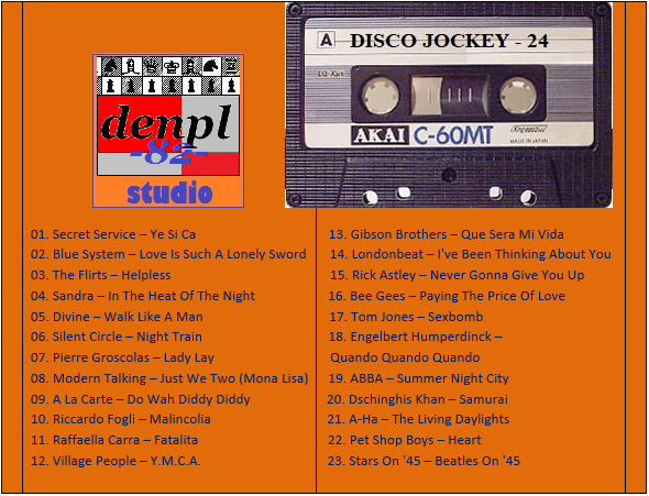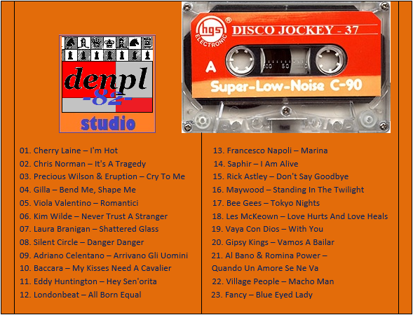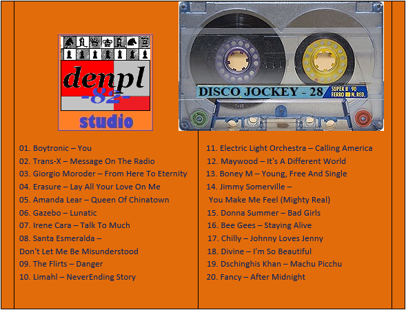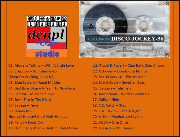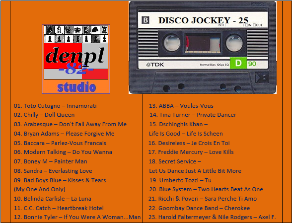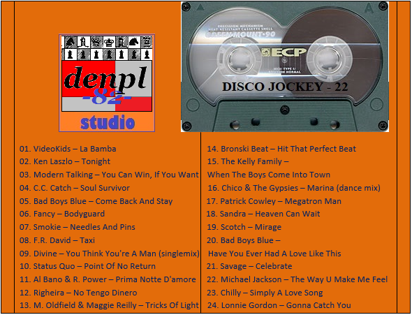 01. VideoKids – La Bamba 02. Ken Laszlo – Tonight 03. Modern Talking – You Can Win, If You Want 04. C.C. Catch – Soul Survivor 05. Bad Boys Blue – Come Back And Stay 06. Fancy – Bodyguard 07. Smokie – Needles And Pins 08. F.R. David – Taxi 09. Divine – You Think You’re A Man (denpl-82 single mix) 10. Status Quo – Point Of No Return 11. Al Bano & Romina Power – Prima Notte D’amore 12. Righeira – No Tengo Dinero 13. Mike Oldfield & Maggie Reilly & Barry Palmer – Tricks Of The Light 14. Bronski Beat – Hit That Perfect Beat 15. The Kelly Family – When The Boys Come Into Town 16. Chico & The Gypsies – Marina (Don Jordi dance mix) 17. Patrick Cowley – Megatron Man 18. Sandra – Heaven Can Wait 19. Scotch – Mirage 20. Bad Boys Blue – Have You Ever Had A Love Like This 21. Savage – Celebrate 22. Michael Jackson – The Way You Make Me Feel 23. Chilly – Simply A Love Song 24. Lonnie Gordon – Gonna Catch You