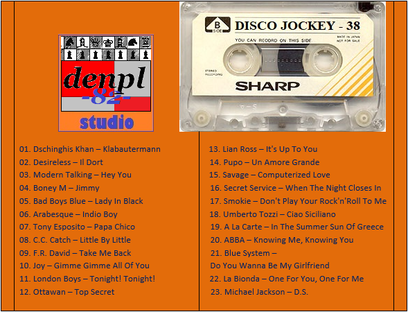 DISCO JOCKEY – 38 Студия «denpl-82». Составил и Смикшировал: DJ denpl-82 Время звучания: 89 min.