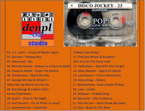 01. C.C. Catch – House Of Mystic Lights 02. Baccara – Fantasy Boy 03. Maywood – Rio 04. Belinda Carlisle – Heaven Is A Place On Earth 05. Depeche Mode – Enjoy The Silence 06. Fantastique – Maria No Mas 07. George Michael & Wham! – Wake Me Up Before You Go–Go 08. Boy George & Culture Club – Karma Chameleon 09. Saphir – Shot In The Night 10. Rod Stewart – Do Ya Think I’m Sexy? 11. Samantha Fox – Touch Me (I Want Your Body) 12. Precious Wilson & Eruption – (We Are) On The Race Track 13. Patty Ryan – Stay With Me Tonight 14. Mike Mareen – Agent Of Liberty 15. LaserDance – Future Generation 16. Gipsy Kings – Volare 17. Bananarama – Every Shade Of Blue 18. Lime – Guilty 19. Ottawan – Shalala Song 20. Boney M – Silly Confusion 21. Den Harrow – Don’t Break My Heart 22. Styx – Boat On the River