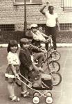 Что-то тема совсем заглохла. Ну что ж, начну вспоминать. Смутно помню нечто трёхколёсное на даче в Салтыковке (у ближних дедов) и в селе Свобода (у дальних дедов). Потом был синий Дружок. Он был уже в Мытищах, но иногда его возили и на дачу в Салтыковку. Это начало 90-х. Сначала катался на четырёх колёсах, затем на двух. После меня на нём катались братья: Саша, затем Женя. А когда я и братья подросли - началась "эпоха" групповых велокатаний летом по Салтыковке. Катались вчетвером: я с братьями Сашей и Женей, и сосед Пашка. Выходит, великов было уже три, но я помню только два из них: голубой Ereliukas (Орлёнок) с "мужской" рамой, и серая складная "Десна" с низкой рамой. Какой был третий - не помню, не помню и Пашкин велик. В Свободе был какой-то красный велик с низкой рамой (название чё-то не вспоминается). В Свободе великов на всех не хватало, катались по очереди. А вот в Салтыковке - каждое лето устраивали групповые покатушки в середине - конце 90-х. Я веловодитель осторожный, и если я за рулём, то травм никогда не было. Максимум, на что я способен - резко затормозить с высокой скорости так, чтобы шина завизжала, а на асфальте осталась чёрная полоса. А вот когда я был пассажиром, был случай. Есть у деда (ближенго, Салтыковского) велосипед "Украина" выпуска 60-х годов. На верхнюю трубу рамы он приделел детское сиденье, похожее на подголовник от Москвича-2141, а на нижнюю - подножку типа как на мотоцикле. Летним вечером где-то в середине 90-х вёз меня дед на своей "Украине" из Салтыковки в Балашиху. Ехали по тропинке через лес. До города оставалось несколько десятков метров, когда я заскучал, и встал с седухи, закрыв деду видимость. А потом вообще убрал ноги с подножек, и повис на руках, держась за руль. И тут моя левая нога попала в колесо. И мы с дедом полетели физиономиями вперёд. Дед меня обхватил руками, и я честно говоря удара об землю не почувствовал. А нога болела просто зверски. Дед же лишился зуба или двух, порвал сухожилие на указательном пальце не помню какой руки (с тех пор у него этот палец похож на линию со знака "Опасный поворот"). Ногой я выломал из колеса несколько спиц. Перелома не было, только разодрана кожа до мяса. Кое-как доползли до Балашихи, дед мне ногу забинтовал, затем двинулись обратно в Салтыковку, уже впотьмах. Я сидел на велике, а дед его катил. Нога зажила благополучно, без рубца, а вот палец у деда так и остался кривым.