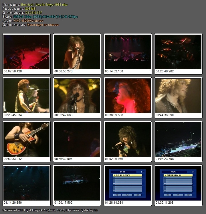 Bon Jovi - Live In Tokyo 1985.mkv  Год выпуска: 2011 г. Лейбл: StarlightFilm Видео:640x480(4:3),29970fps,AVC(High@L4.0) Аудио:AAC(LC),48000Hz,2ch, Жанр:pok Год:1985 Размер:808МВ Время:1час35мин Треклист(Tracklist):1 Tokyo Road 2 Breakout 3 Only Lonely 4 Tico Intro 5 She don't know me 6 Shot Through The Heart 7 Silent night 8 Hardest Part Is The Night 9 In And Out Of Love 10 Runaway 11 Burning for love 12 Get Ready Файлообменник: Depositfiles.com